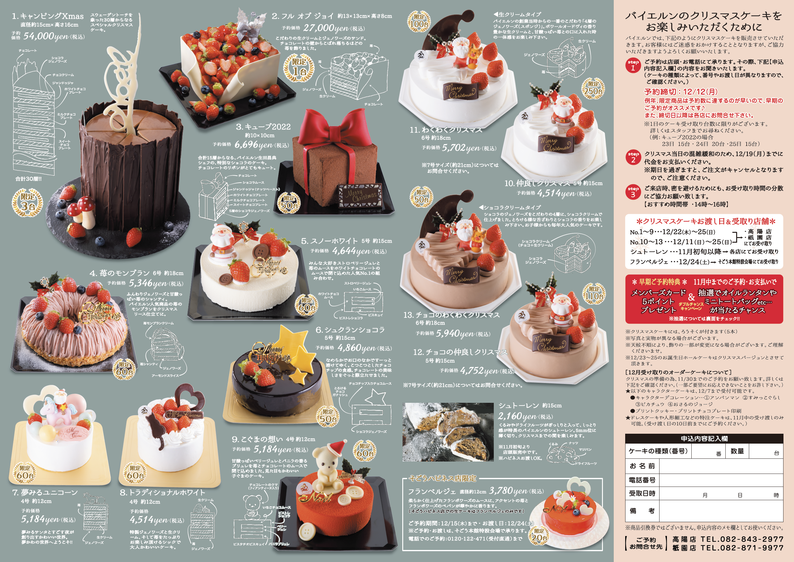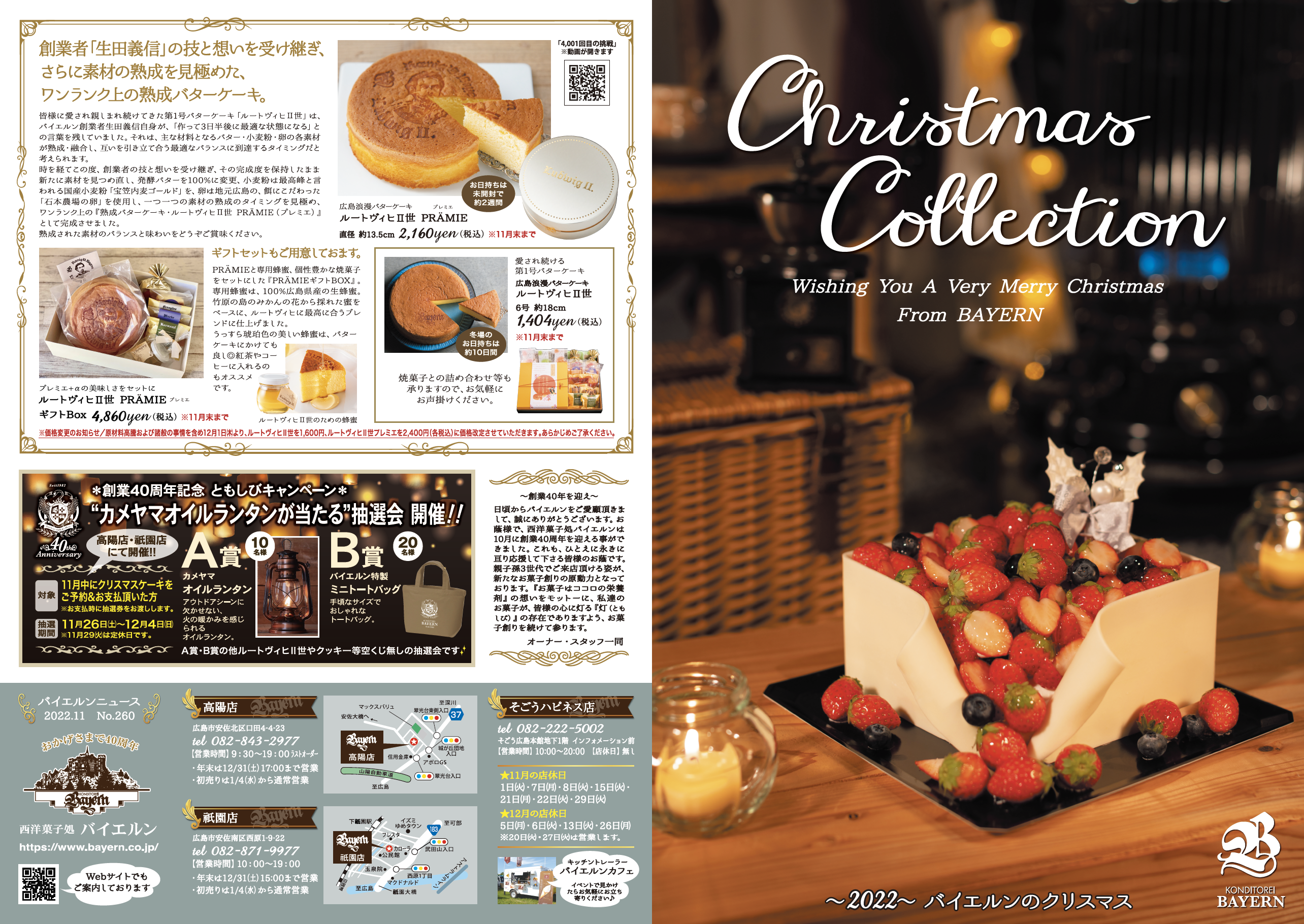 2022-11-02 NEWS 2022クリスマスコレクション 今年のクリスマスケーキのご予約受付を開始いたしました。 11月中にご注文完了のお客様には、抽選会の参加券をお渡し致します♪ どうぞよろしくお願い致します。